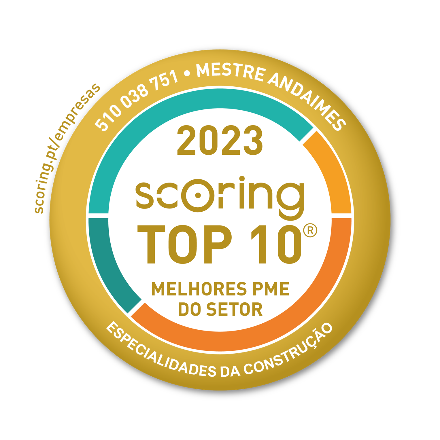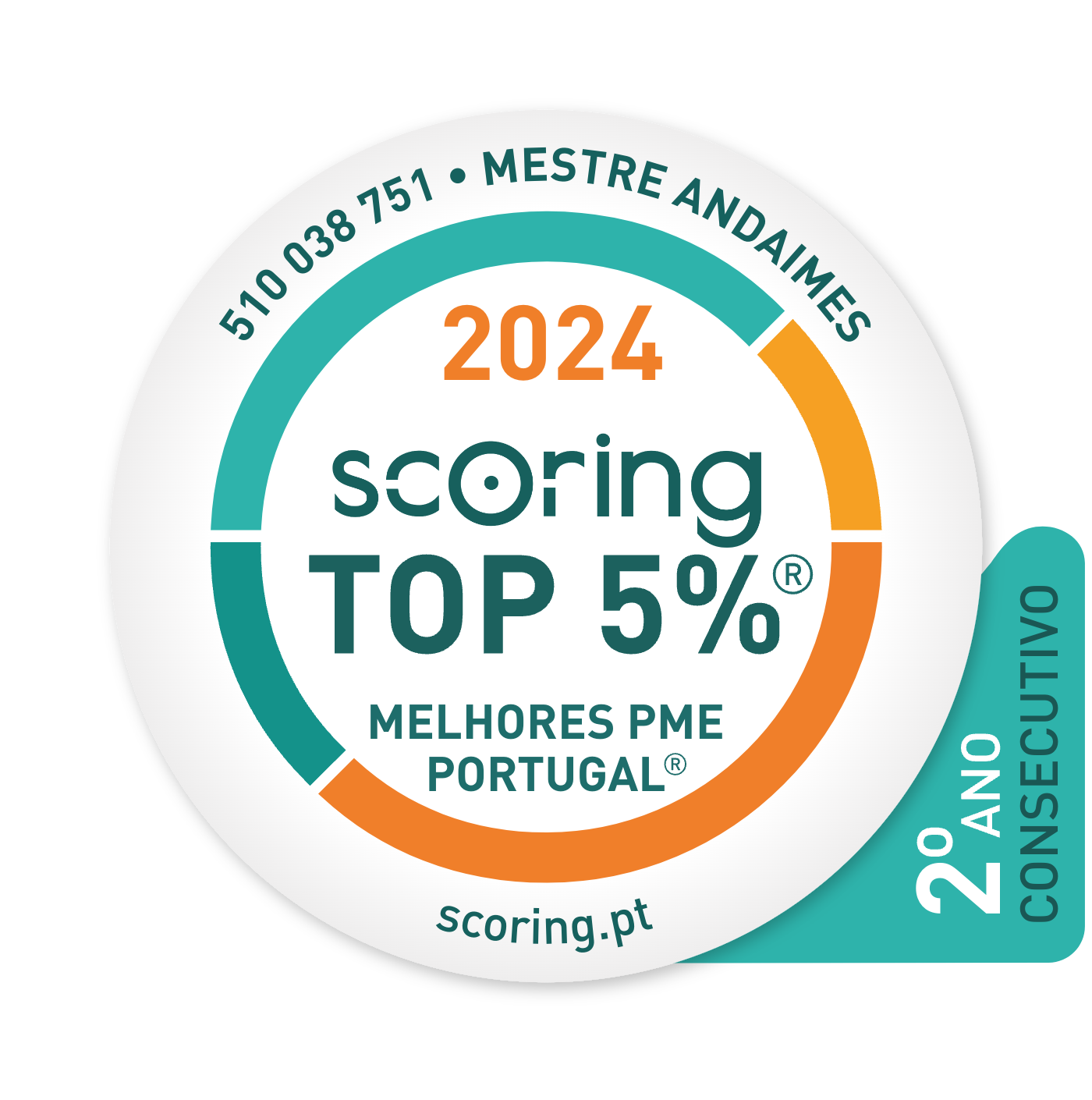 A "MESTRE ANDAIMES - ALUGUER E VENDA DE ANDAIMES, LDA" foi distinguida pela SCORING com a Certificação "TOP 5% MELHORES PME DE PORTUGAL”, edição 2024. A SCORING certifica que a empresa cumpriu os requisitos de acesso à certificação e obteve, de acordo com o método ScorePME e no exercício fiscal de 2023, um Índice de Desempenho e Solidez Financeira superior a 80%, evidenciando ainda consistência nas vertentes económica e financeira, o que só é acessível a menos de 5% das empresas nacionais. Em conformidade, obteve Notação SCORING "EXCELENTE" ("NS 5"), o que lhe confere em termos de sustentabilidade económico-financeira, a distinção “TOP 5% / 2024” atrás referida.