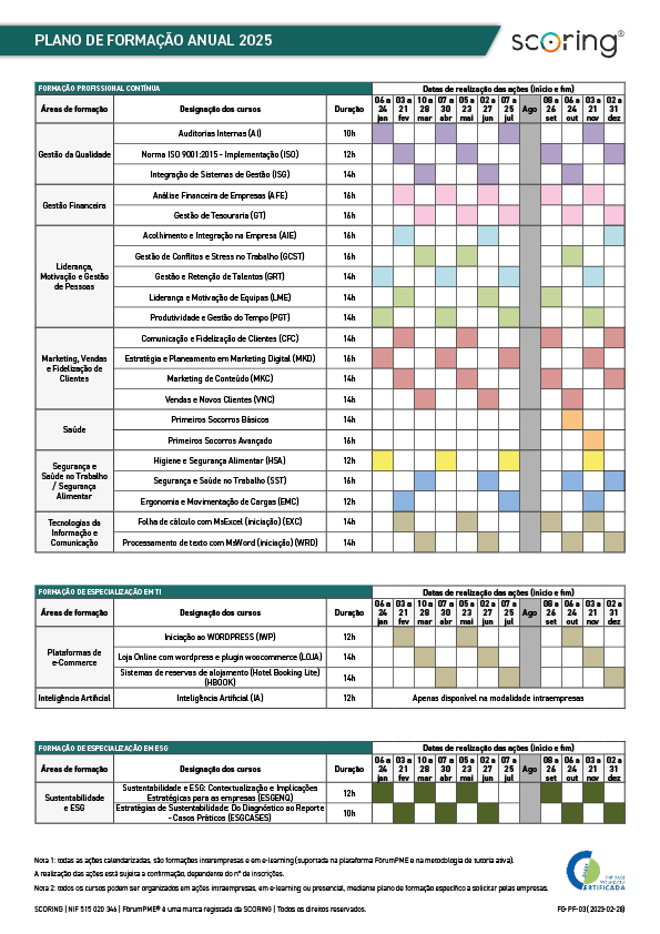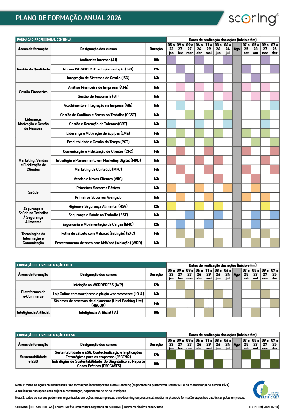 A área de formação da SCORING está focada nas necessidades de formação das PME nacionais, oferecendo soluções dinâmicas, especializadas e personalizadas para as diferentes tipologias e setores de atividade: um plano de formação à medida de cada colaborador.