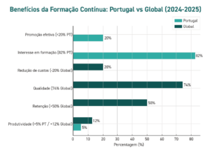 Em termos tangíveis, estudos apontam que as empresas portuguesas registam um aumento médio de 5% na produtividade com formação contínua (IT Insight, 2024), enquanto a nível internacional esse aumento pode chegar aos 12% (OCDE, 2024). Por outro lado, 74% das empresas líderes reconhecem a formação como essencial para garantir qualidade e promover a inovação (World Economic Forum, 2024). A formação digital, nomeadamente em contexto de upskilling, pode ainda reduzir custos operacionais em cerca de 20% (McKinsey, 2024). Em termos financeiros, as organizações que investem mais de 3% da sua faturação anual em formação apresentam, em média, um crescimento 8% superior à concorrência (Deloitte, 2024).